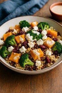 Herfstige linzensalade met geroosterde pompoen, broccoli, linzen, tarwe, feta, veenbessen en tahindressing.